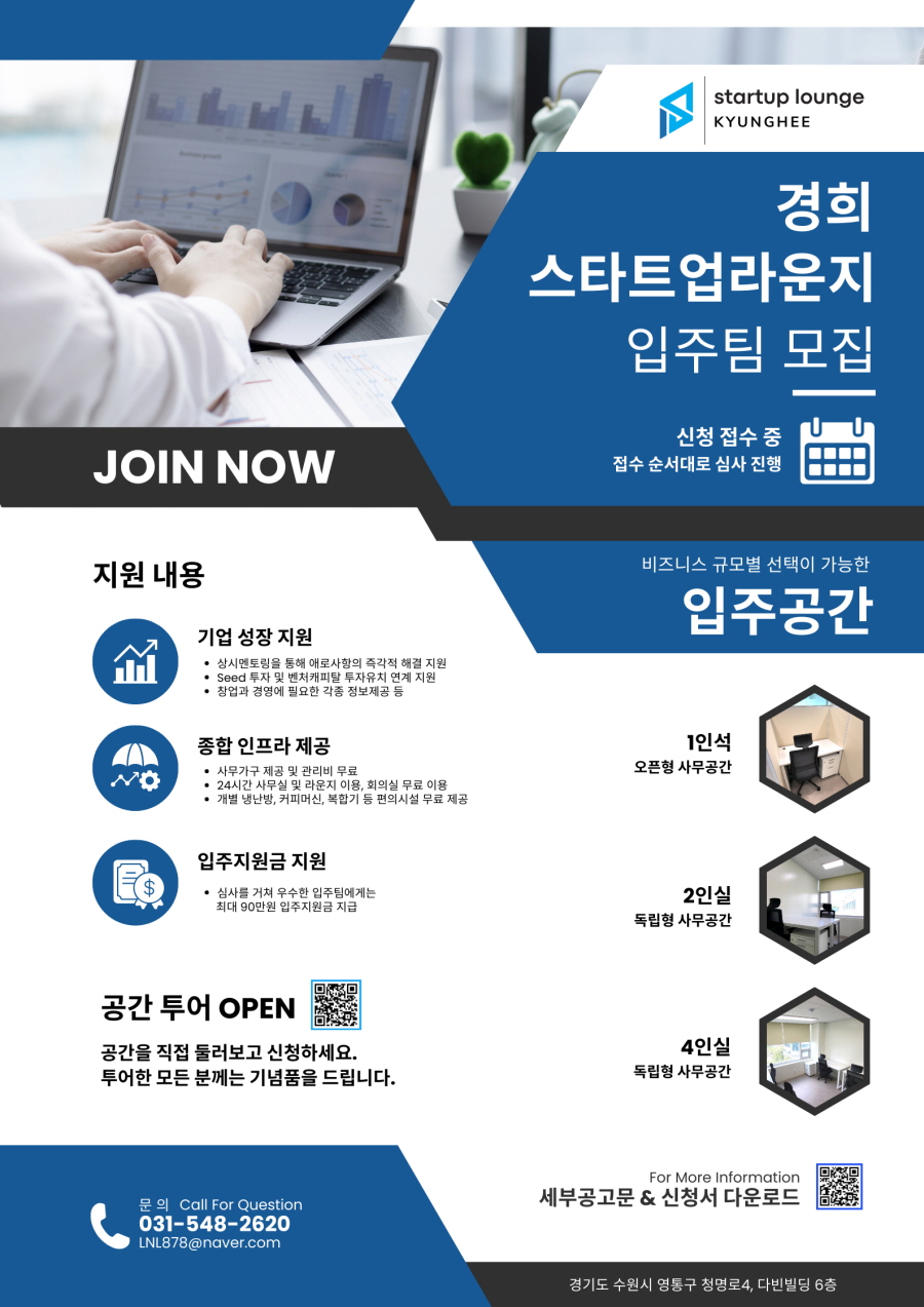 경희 스타트업 라운지는 유망 스타트업을 발굴하고, 육성하기 위해 마련된 혁신적인 창업베이스캠프입니다. 무한한 가능성과 잠재력을 발휘할 1인석 창업팀을 모집하고 있사오니 관심있는 분들의 많은 지원바랍니다! - 소재지 : 경기도 수원시 영통구 청명로 4, 6층 (경희대 국제캠퍼스 인근) - 모집규모 : 1인석 4개 - 월이용료 : 15만원 (관리비 및 부가세 포함) * 우수 사업팀은 입주지원금 지급 - 기타 세부사항은 공고문 참조 : https://cafe.naver.com/kyungheestartup/3 - 공간 투어 신청 : https://naver.me/GCgOHRDP ![]()